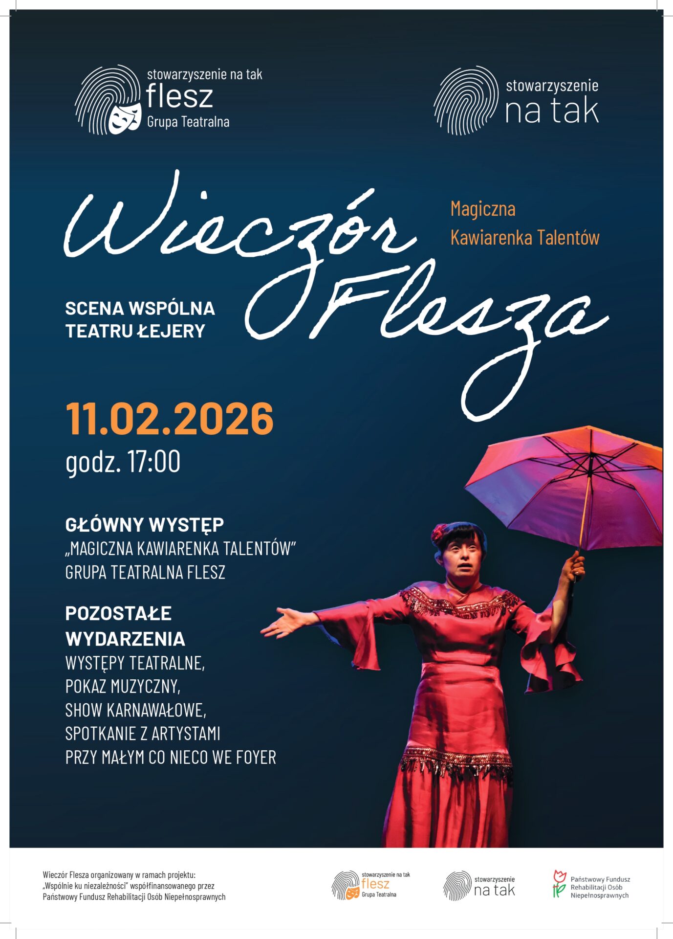Na scenie pojawią się także zaproszeni goście. W programie m.in. występy teatralne, pokaz muzyczny oraz elementy karnawałowe. Po części scenicznej zapraszamy do foyer na krótkie spotkanie z artystami przy kawie i drobnym poczęstunku.